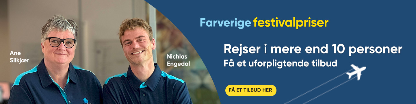 Vi giver dig prisgaranti på alle festival-tilbud til og med d. 27. januar 2026. Falder prisen på din rejse, fra du bestiller frem til d. 27. januar 2026, har du altså krav på at få rejsen til den nye pris. Vi giver gratis ombooking på alle festival-tilbud med afrejse fra 1. maj 2026 og frem. Bestiller du i dag, men finder et bedre tilbud i morgen, koster det altså ikke noget at skifte mening. Prisgaranti og gratis ombooking gælder til og med d. 27. januar 2026, hvis du finder et bedre tilbud. Prisgaranti og gratis ombooking gælder på alle rejser med afrejse fra 1. maj 2026 til og med 31. december 2027.